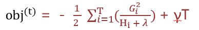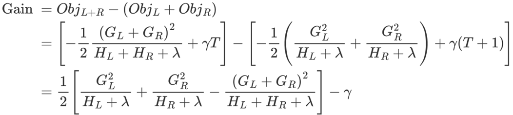 公式计算结果是节点输出,类似于梯度提升树输出越小越好。节点有2个分枝,或者不分枝,gain等于不分枝减去2个分枝之和:结果大于0时分枝,结果小于0不分枝。